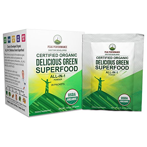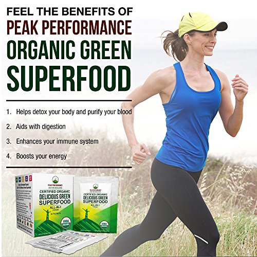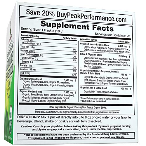 Peak Performance Organic Greens Superfood Powder Single Serve Travel Packets. Best Tasting Organic Green Juice Super Food with 25+ All Natural Ingredients for Max Energy and Detox. (20 Pack)